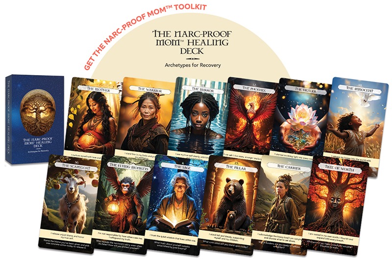 45 therapeutic cards with daily prompts • Guided booklet with step-by-step exercises • Portable design for use anytime, anywhere • Supports the full Narc-Proof Mom™ Method